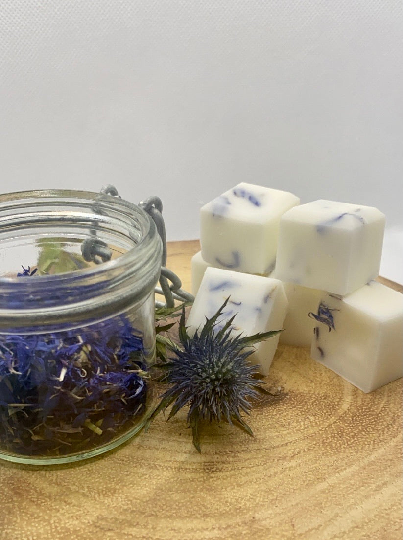 Our 6 wax melt cubes, and are presented in fully recyclable and biodegradable packaging. High performance wax infused with fragrance and Cornflower petals. They can be used as many times as you wish, until all the fragrance has evaporated; then simply change the wax and add another cube. Diffusion time 12-16 hrs approx per cube.